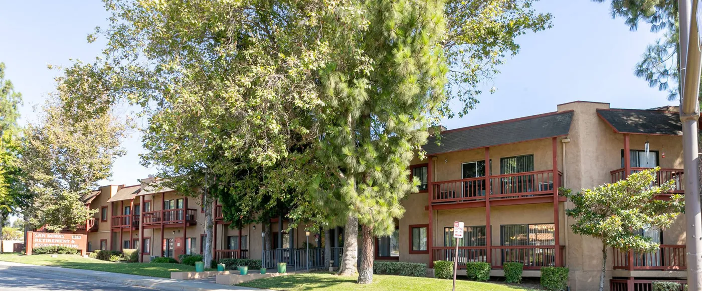 Garden patios, balconies, and outdoor spaces across a three-acre property — this is unusually expansive for a small care home. The mountain backdrop and suburban San Dimas setting provide a genuinely peaceful environment.