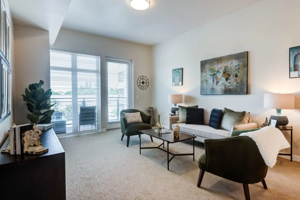 The community features the Anytime Dining program with fresh restaurant-style meals served from 7 AM to 7 PM, a rooftop terrace with spectacular views, a theater, library, and bistro. Studios, one-bedroom, and two-bedroom layouts are available, all with concierge services and 24-hour staffing.