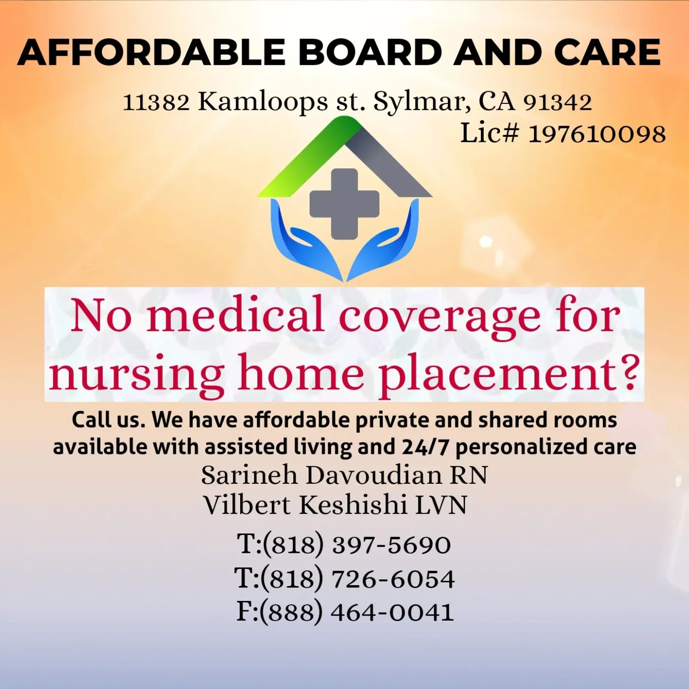 View full state recordSylmar Board & Care is a 6-bed residential care home in Sylmar, part of the Affordable Board and Care network operated by owner Vilbert and his family. The home offers 24-hour caregiving with an RN/LVN on site, medication management, personal care including feeding, dressing, and grooming, plus optional services like physical therapy and hospice support.